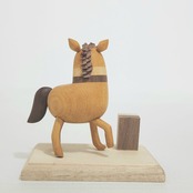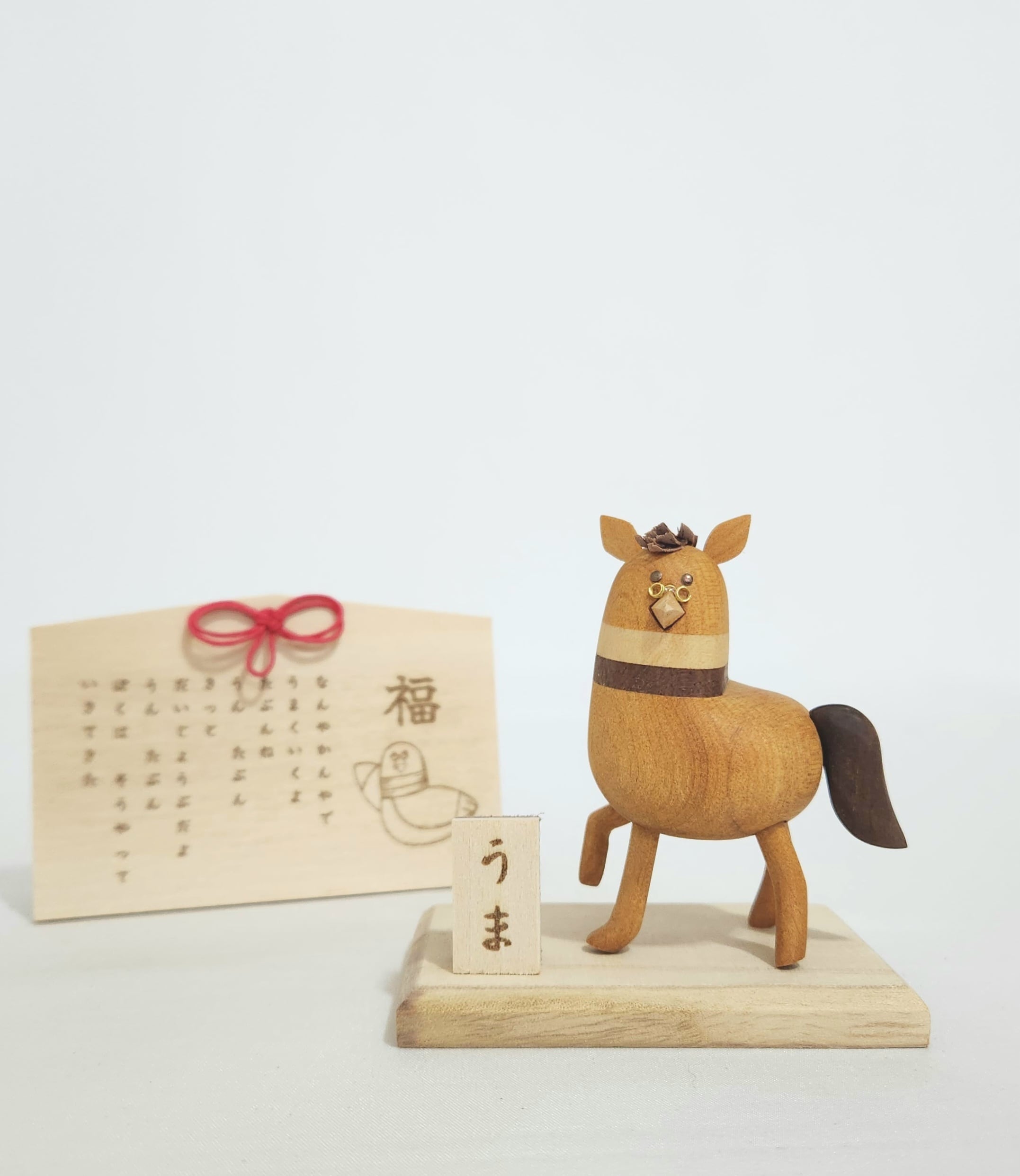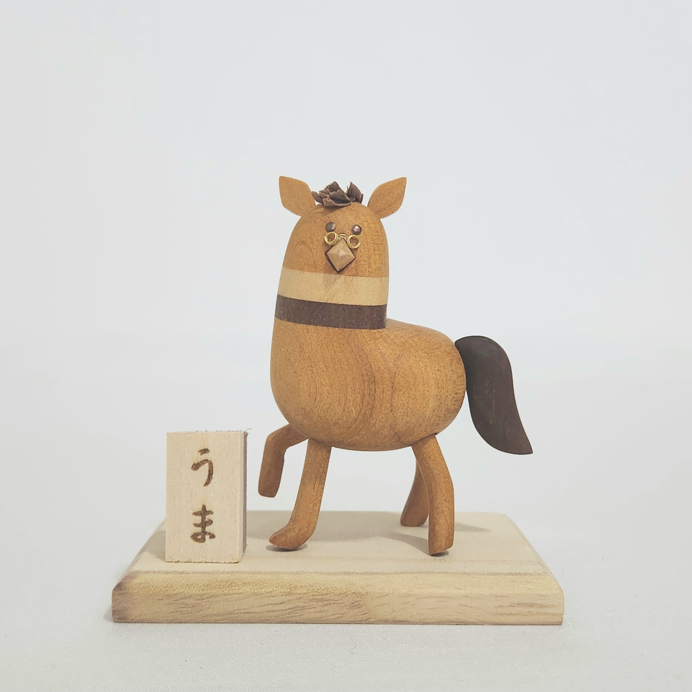 ・木彫りの旨年はーとさん(台座,「うま」プレート込)